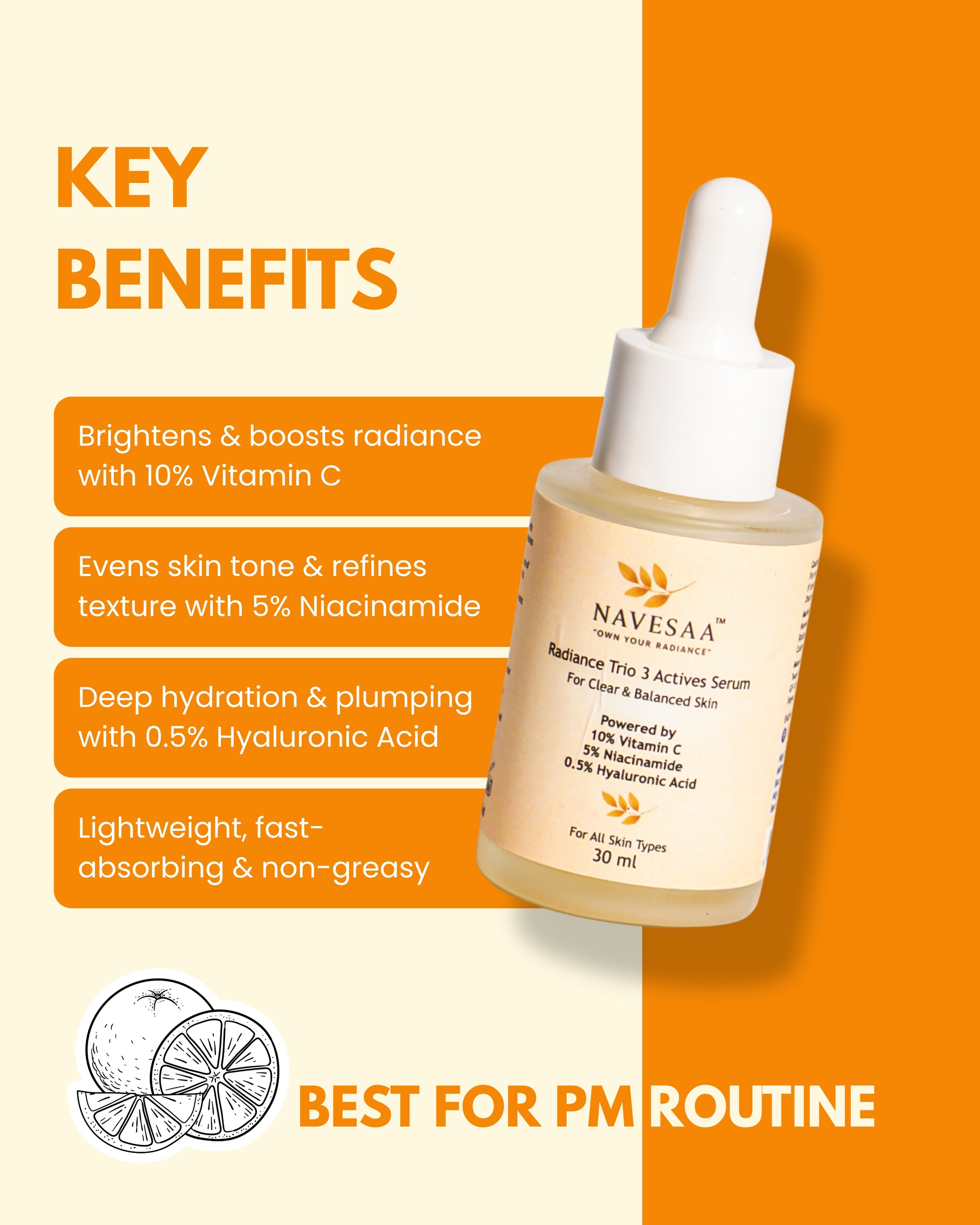 Power your skincare routine with NAVESAA Radiance Trio 3 Actives Serum, a lightweight yet potent formulation designed to visibly brighten, balance, and hydrate the skin.