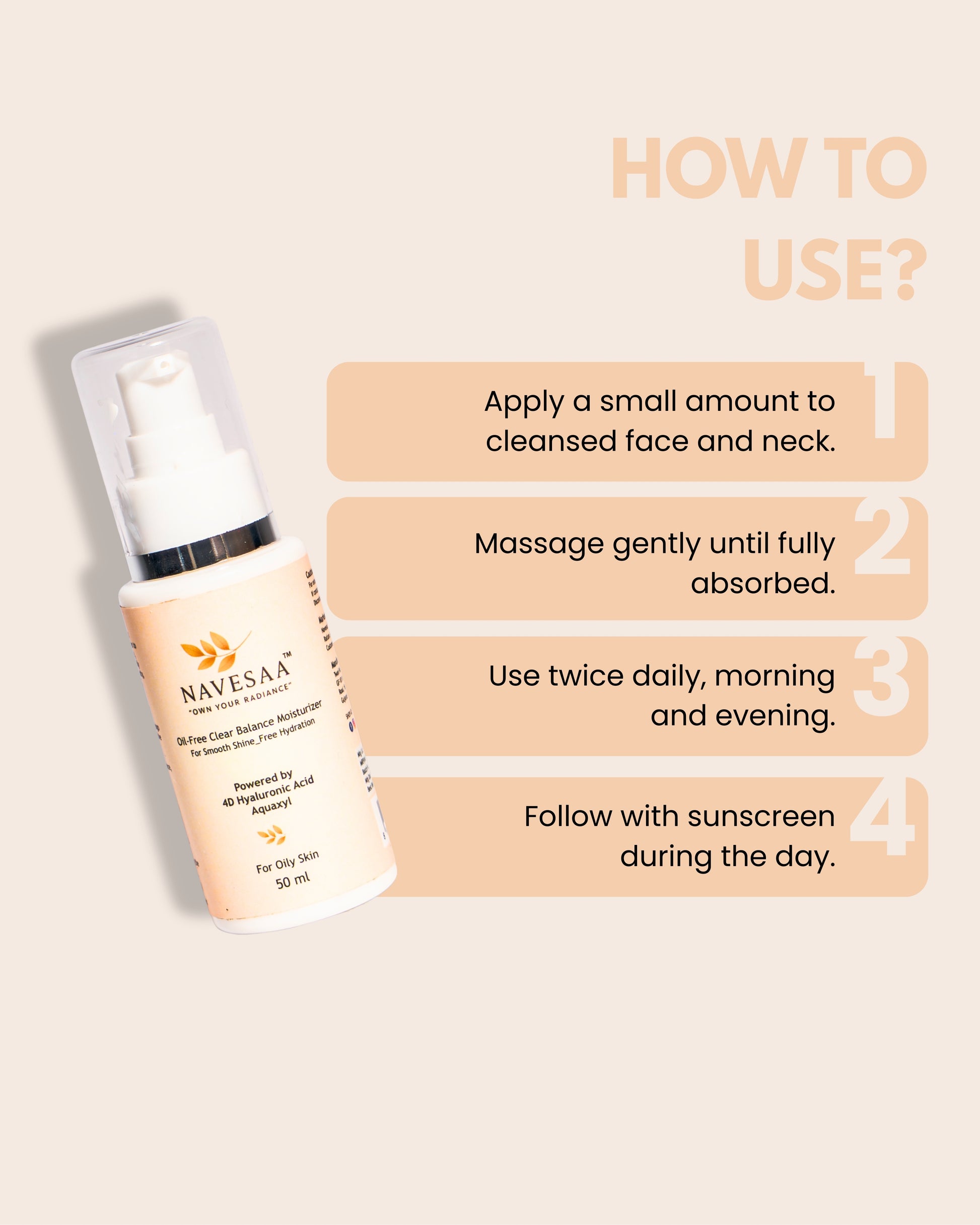- Apply a pea-sized amount of moisturiser to face and neck.