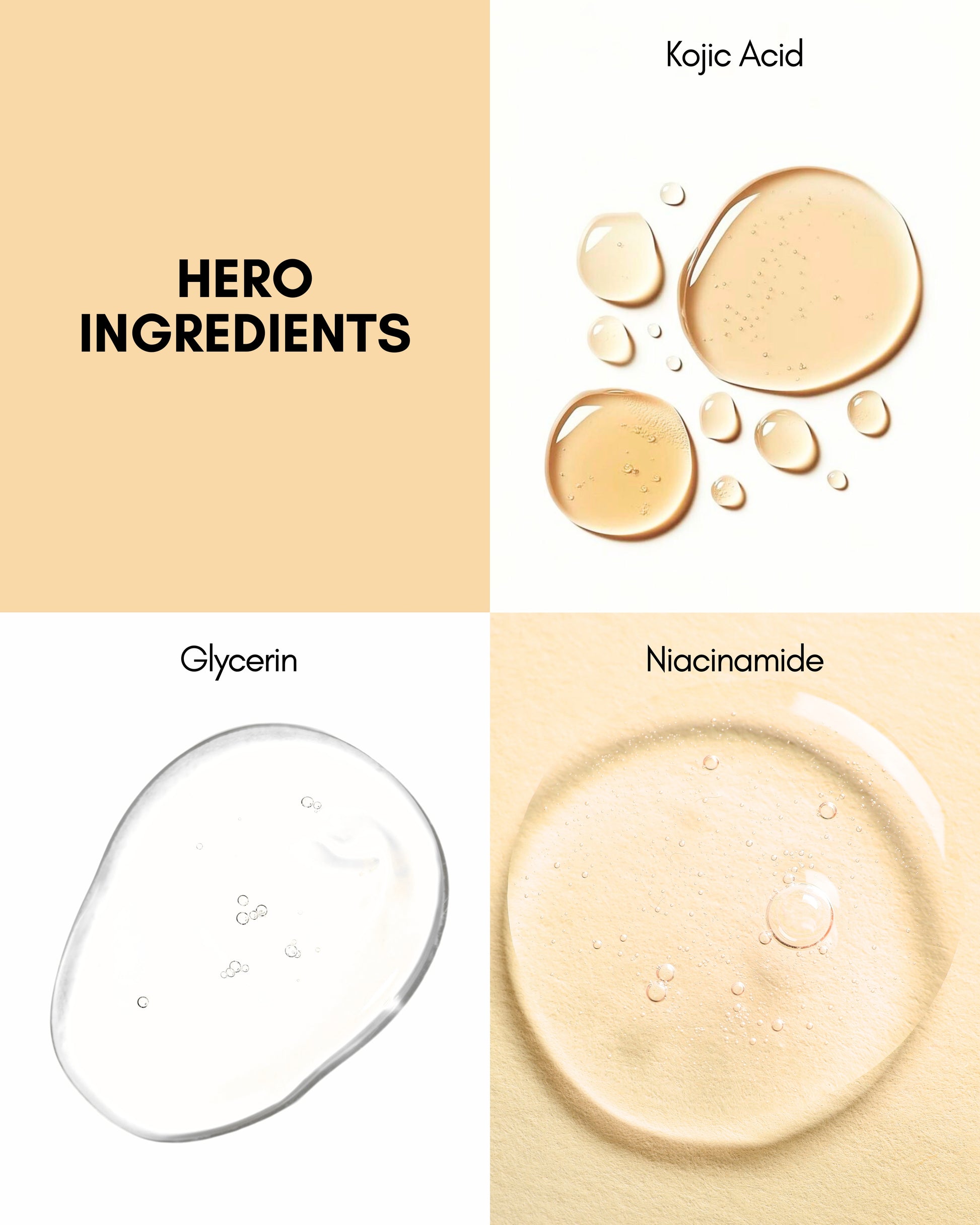 - Kojic Acid: Helps brighten skin and improve uneven tone
